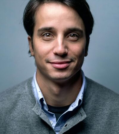A family stands together outdoors with palm trees and buildings visible in the background. The group consists of two adults and three children, with the mother on the left and the father on the right. They are casually dressed and appear to be in a park or promenade setting.